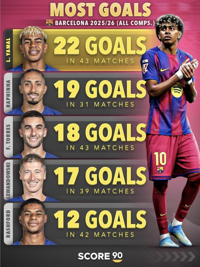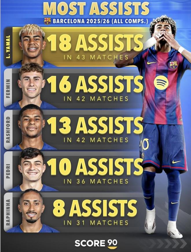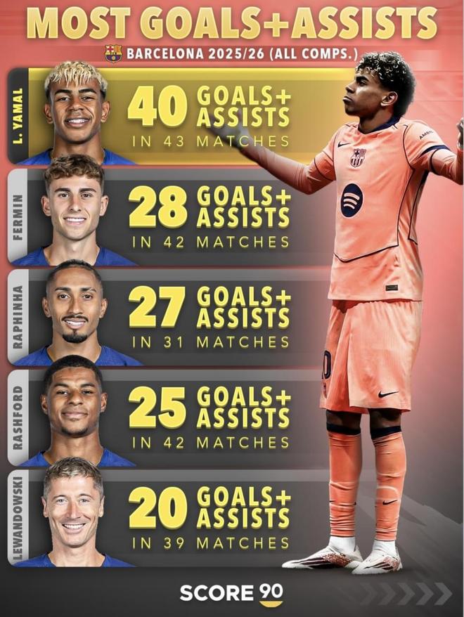 在巴萨这样的顶级豪门里,这种数据结构含金量极高。巴萨前场从不缺人,莱万、拉菲尼亚、费尔明、佩德里甚至拉什福德都能分走球权和开火权。在这样的竞争环境下,还能把进球、助攻和总参与进球全部刷到第一,难度远比在单核球队里当老大要高。亚马尔现在的表现,不只是亮眼,而是整条进攻链条上最核心、最完整的输出点。